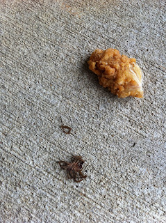 Here is what is left of him, with a chicken finger next to him for size comparison.